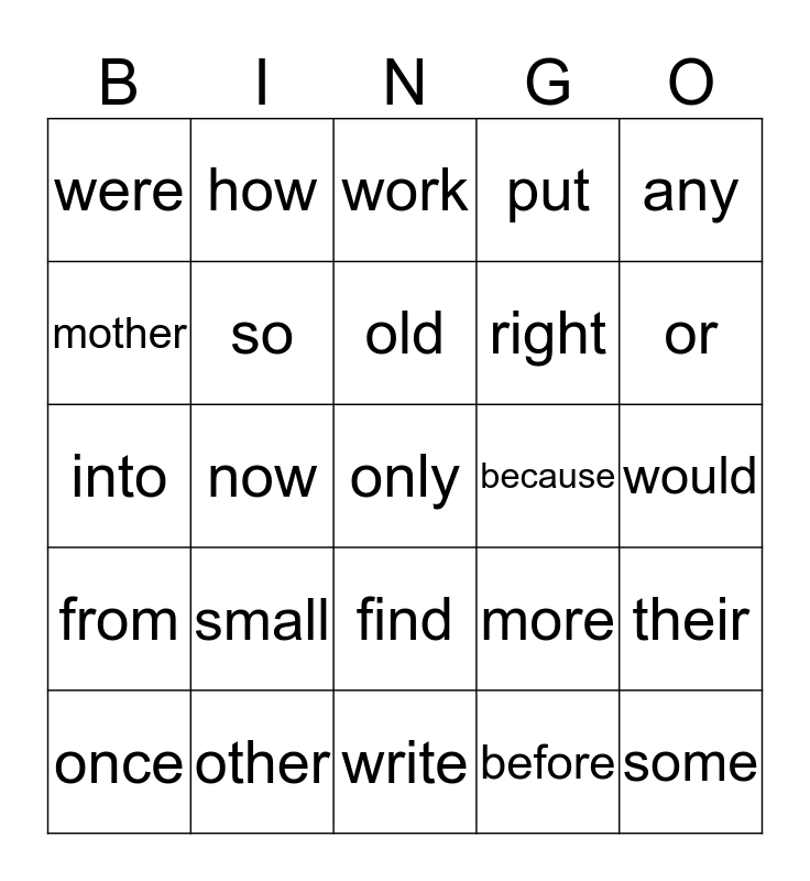 This bingo card has 33 words: some, way, now, water, from, so, any, once, how, people, old, work, after, about, because, or, other, into, small, more, find, over, were, would, write, only, put, right, mother, their, been, before and your.