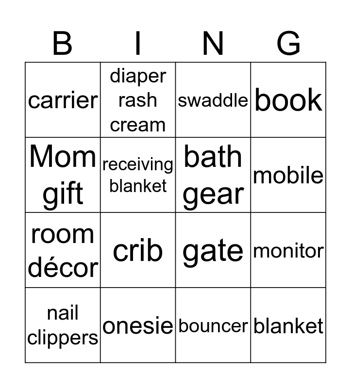 This bingo card has 39 words: Free!, baby shampoo/soap, hat, bath gear, lotion, bath toys, mobile, bib, Mom gift, blanket, monitor, book, nail clippers, bouncer, onesie, burp cloth, outfit, carrier, pacifier, changing pad, receiving blanket, comb/brush, room décor, crib, shoes, crib sheet, sleeper, detergent, socks, diaper rash cream, stuffed animal, diapers, swaddle, diaper bin, teether, frame/photo album, toy, gate and wipes.