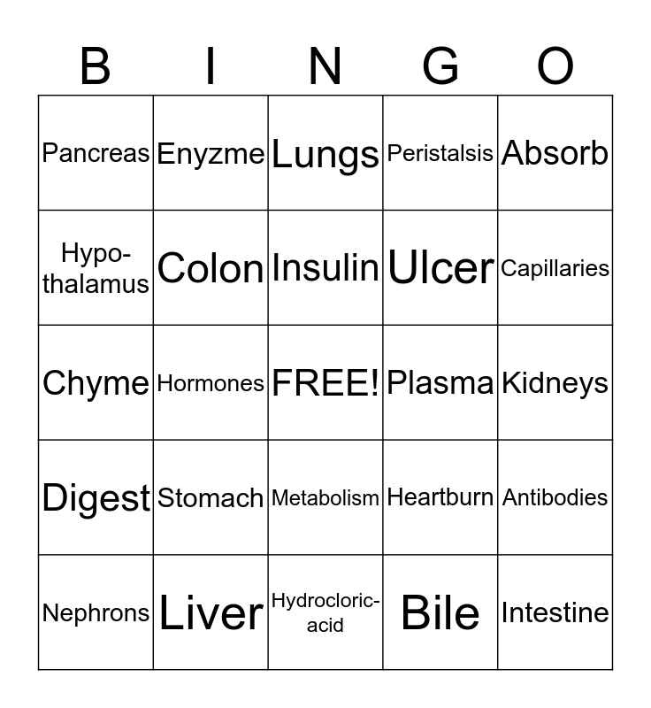 This bingo card has a free space and 24 words: Stomach, Liver, Insulin, Nephrons, Absorb, Pancreas, Hypo-thalamus, Enyzme, Plasma, Metabolism, Ulcer, Chyme, Heartburn, Antibodies, Colon, Bile, Kidneys, Lungs, Capillaries, Hormones, Intestine, Digest, Peristalsis and Hydrocloric-acid.
