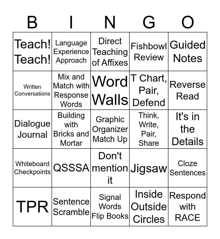 This bingo card has a free space and 42 words: Same Scene Twice, Mix and Match with Response Words, Double Vision Video, Inside Outside Circles, Read Aloud, Dialogue Journal, QSSSA, Anchor Charts, Fishbowl Review, Cloze Sentences, Written Conversations, Building with Bricks and Mortar, Jigsaw, Reverse Read, Echo Echo, Sentence Scramble, Common Thread, Think, Write, Pair, Share, Sticky Thinking, Teach! Teach!, Language Experience Approach, 360 Words, The Expert and the Novice, Guided Notes, Triangle Circle Square, Which Corner, Word Walls, Do you know, Writing Windows, TPR, Numbered Heads Together, Signal Words Flip Books, T Chart, Pair, Defend, Respond with RACE, Learning 1-2-3, Clock Buddies, Don't mention it, It's in the Details, Whiteboard Checkpoints, 5 and 2, Direct Teaching of Affixes and Simultaneous Roundtable.