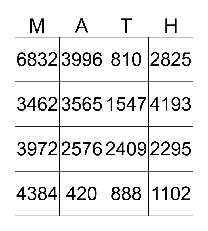 This bingo card has 16 words: 420, 2295, 810, 6832, 3972, 3996, 2409, 888, 3462, 3565, 4384, 2825, 2576, 4193, 1547 and 1102.