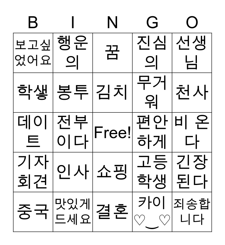 This bingo card has a free space and 29 words: 중국, 햄버거, 전부이다, 거절, 보고싶었어요, 꿈, 봉투, 인사, 편안하게, 맛있게 드세요, 비 온다, 죄송합니다, 결혼, 카이 ♡‿♡, 천사, 안녕하세요, 쇼핑, 기자 회견, 선생님, 데이트, 고등학생, 친해졌어요, 무거워, 학샣, 진심의, 행운의, 긴장된다, 김치 and 로터.