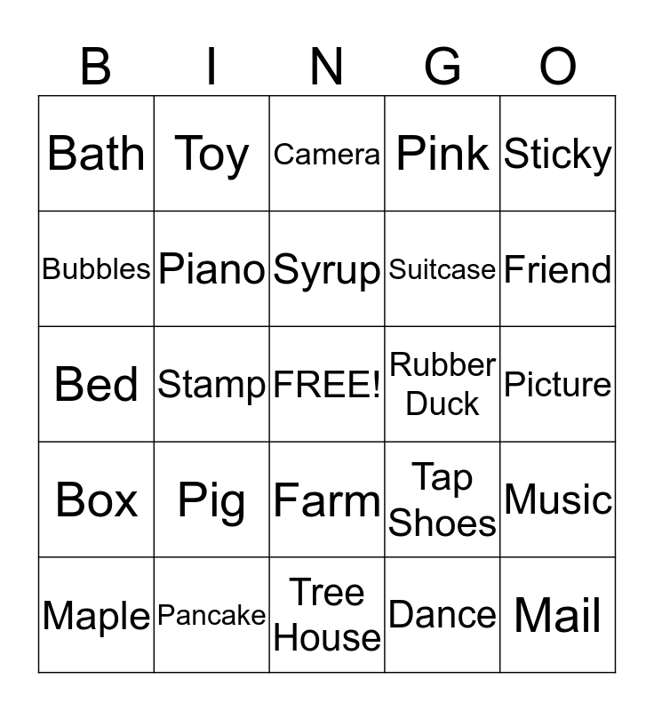 This bingo card has a free space and 24 words: Pig, Pancake, Syrup, Maple, Sticky, Bath, Bubbles, Toy, Rubber Duck, Farm, Suitcase, Bed, Tap Shoes, Music, Piano, Dance, Picture, Camera, Friend, Stamp, Mail, Box, Pink and Tree House.