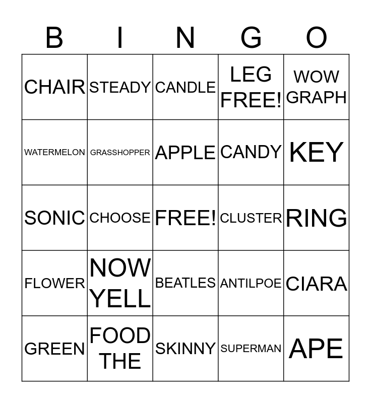 This bingo card has a free space and 41 words: B I N G O, SONIC, BOY, GRASSHOPPER, FOOD THE, BEATLES, APPLE, MATH, WOW GRAPH, FLOWER, CHOOSE, LEG FREE!, APE, RING, CLUSTER, NOW YELL, NO, CHAIR, SHOE, CANDLE, CIARA, PANIC, SKINNY, CANDY, LEGO, WAFFLES, SUPERMAN, BATMAN, KEY, ANIMAL, JUMP, STEADY, GREEN, GERMAN, ANTILPOE, WATERMELON, CHICKEN, OCEAN, AC/DC, CHAIR and PRINCIPLE.