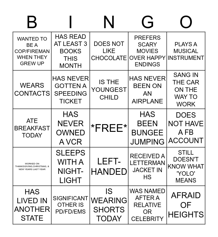 This bingo card has a free space and 24 words: SLEEPS WITH A NIGHT- LIGHT, SIGNIFICANT OTHER IS PD/FD/EMS, IS THE YOUNGEST CHILD, HAS LIVED IN ANOTHER STATE, PLAYS A MUSICAL INSTRUMENT, WANTED TO BE A COP/FIREMAN WHEN THEY GREW UP, WEARS CONTACTS, HAS READ AT LEAST 3 BOOKS THIS MONTH, HAS BEEN BUNGEE JUMPING, LEFT-HANDED, HAS NEVER BEEN ON AN AIRPLANE, ATE BREAKFAST TODAY, RECEIVED A LETTERMAN JACKET IN HS, STILL DOESN'T KNOW WHAT 'YOLO' MEANS, HAS NEVER GOTTEN A SPEEDING TICKET, WAS NAMED AFTER A RELATIVE OR CELEBRITY, DOES NOT HAVE A FB ACCOUNT, DOES NOT LIKE CHOCOLATE, SANG IN THE CAR ON THE WAY TO WORK, HAS NEVER OWNED A VCR, AFRAID OF HEIGHTS, WORKED ON THANKSGIVING,CHRISTMAS, & NEW YEARS LAST YEAR, PREFERS SCARY MOVIES OVER HAPPY ENDINGS and IS WEARING SHORTS TODAY.