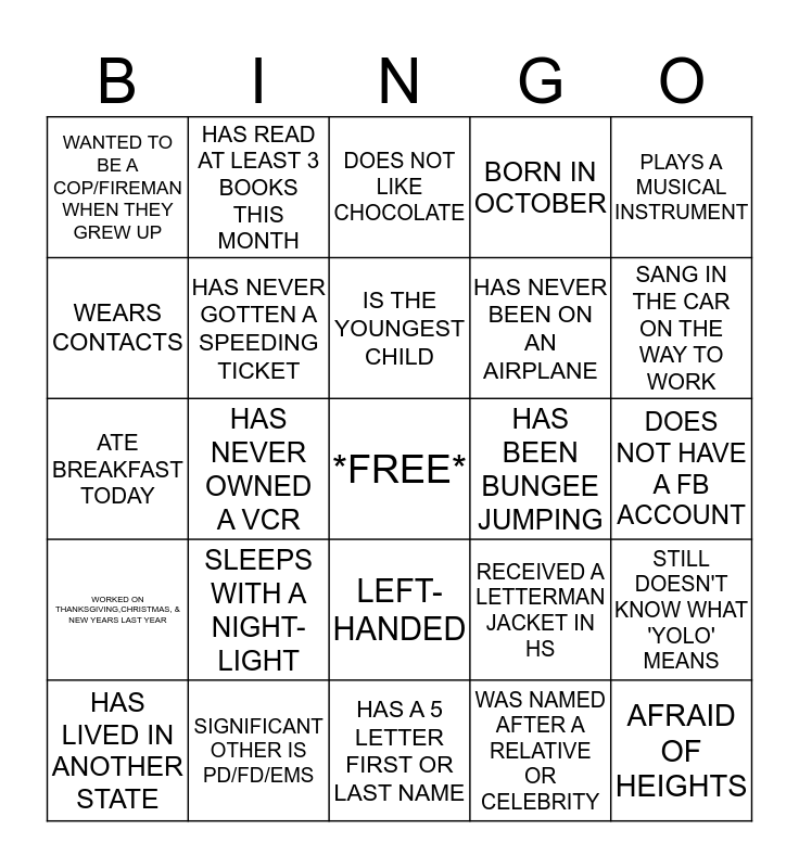 This bingo card has a free space and 24 words: SLEEPS WITH A NIGHT- LIGHT, SIGNIFICANT OTHER IS PD/FD/EMS, IS THE YOUNGEST CHILD, HAS LIVED IN ANOTHER STATE, PLAYS A MUSICAL INSTRUMENT, WANTED TO BE A COP/FIREMAN WHEN THEY GREW UP, WEARS CONTACTS, HAS READ AT LEAST 3 BOOKS THIS MONTH, HAS BEEN BUNGEE JUMPING, LEFT-HANDED, HAS NEVER BEEN ON AN AIRPLANE, ATE BREAKFAST TODAY, RECEIVED A LETTERMAN JACKET IN HS, STILL DOESN'T KNOW WHAT 'YOLO' MEANS, HAS NEVER GOTTEN A SPEEDING TICKET, WAS NAMED AFTER A RELATIVE OR CELEBRITY, DOES NOT HAVE A FB ACCOUNT, DOES NOT LIKE CHOCOLATE, SANG IN THE CAR ON THE WAY TO WORK, HAS NEVER OWNED A VCR, AFRAID OF HEIGHTS, WORKED ON THANKSGIVING,CHRISTMAS, & NEW YEARS LAST YEAR, BORN IN OCTOBER and HAS A 5 LETTER FIRST OR LAST NAME.