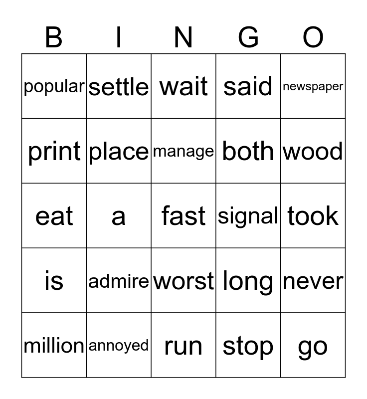This bingo card has a free space and 24 words: admire, annoyed, manage, million, newspaper, popular, print, settle, signal, worst, both, eat, long, never, place, stop, took, wait, wood, a, go, is, said and run.