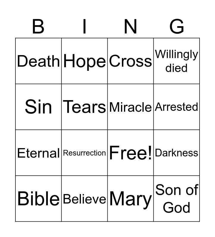 This bingo card has 19 words: Free!, Jesus, Cross, Son of God, Darkness, Sin, Mary, Death, Hope, Eternal, Resurrection, Tears, Miracle, Believe, Bible, Alone, Willingly died, Arrested and Forsaken.