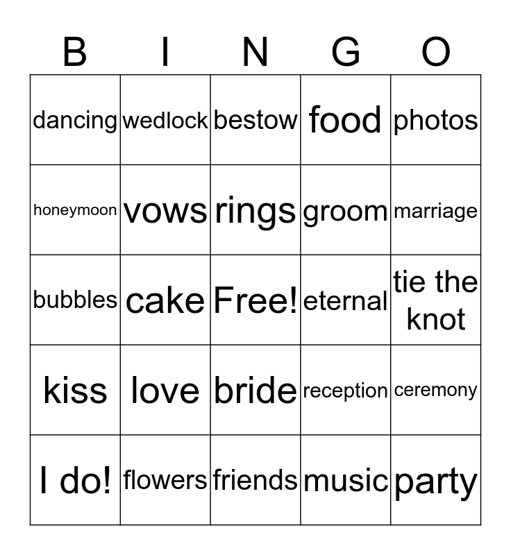 This bingo card has a free space and 24 words: love, flowers, rings, I do!, photos, dancing, honeymoon, wedlock, eternal, bride, groom, bubbles, reception, ceremony, vows, music, tie the knot, bestow, marriage, cake, party, kiss, food and friends.