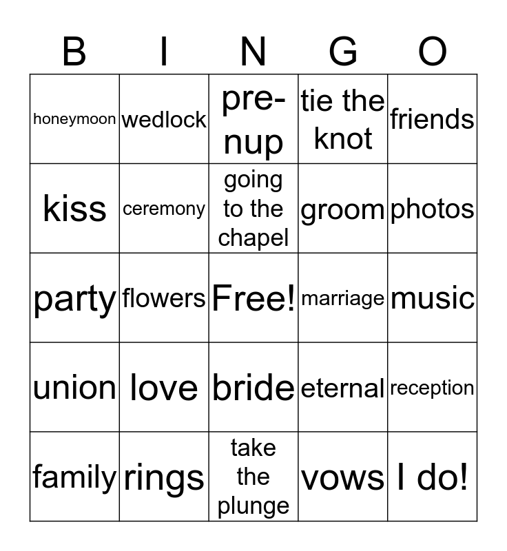This bingo card has a free space and 24 words: love, rings, going to the chapel, family, friends, honeymoon, kiss, wedlock, marriage, bride, groom, party, eternal, reception, ceremony, vows, music, pre-nup, photos, flowers, I do!, union, tie the knot and take the plunge.