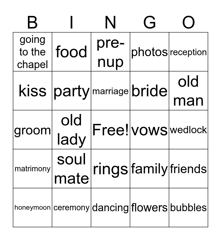 This bingo card has a free space and 24 words: soul mate, ceremony, marriage, honeymoon, reception, going to the chapel, kiss, food, vows, rings, bride, groom, family, friends, party, flowers, wedlock, pre-nup, old man, old lady, bubbles, matrimony, photos and dancing.