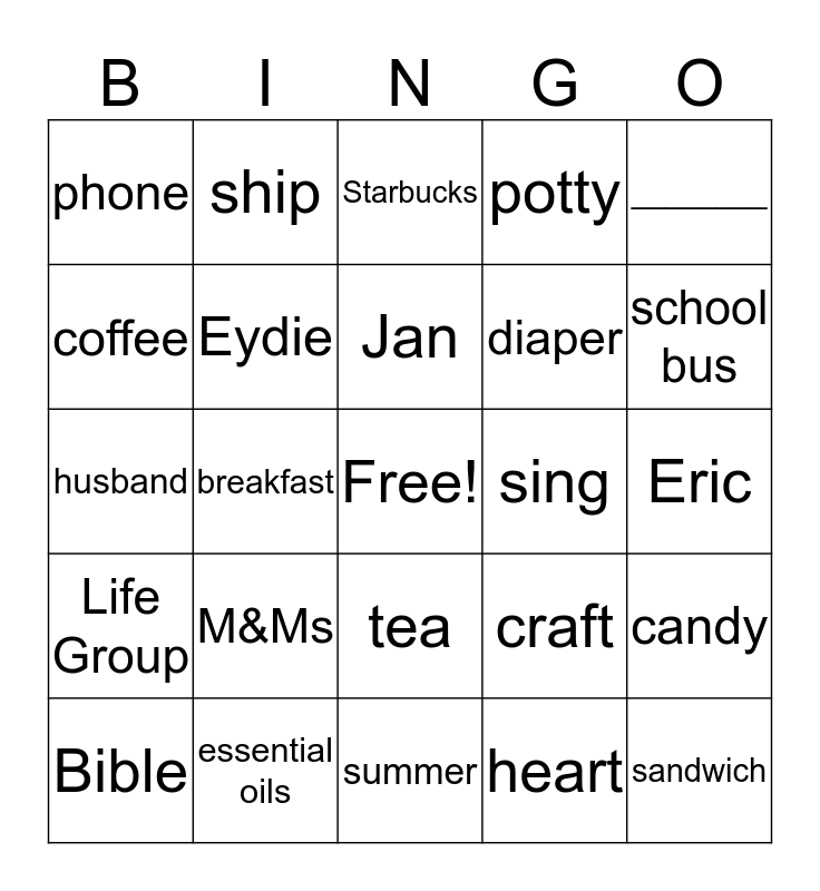 This bingo card has a free space and 28 words: candy, Mom to Mom, diaper, heart, coffee, Starbucks, ship, Life Group, sing, Bible, husband, potty, essential oils, summer, school bus, September, M&Ms, Eydie, Jan, tea, phone, prayer, sandwich, breakfast, Eric, craft, ________ and +++++++.