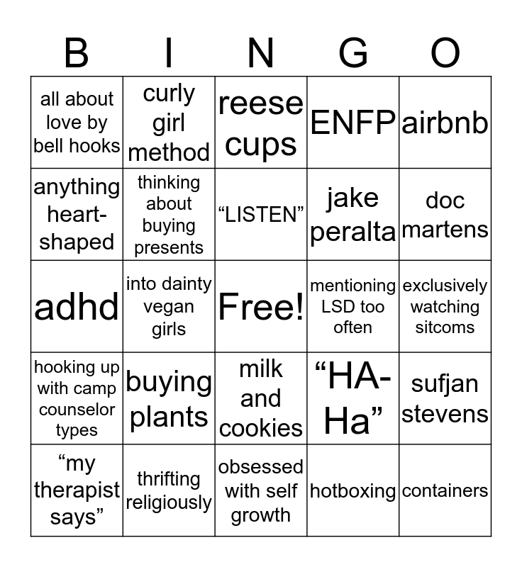 This bingo card has a free space and 24 words: buying plants, thrifting religiously, “LISTEN”, “my therapist says”, airbnb, all about love by bell hooks, anything heart-shaped, curly girl method, mentioning LSD too often, milk and cookies, jake peralta, adhd, “HA-Ha”, sufjan stevens, thinking about buying presents, hotboxing, exclusively watching sitcoms, reese cups, doc martens, into dainty vegan girls, containers, hooking up with camp counselor types, ENFP and obsessed with self growth.
