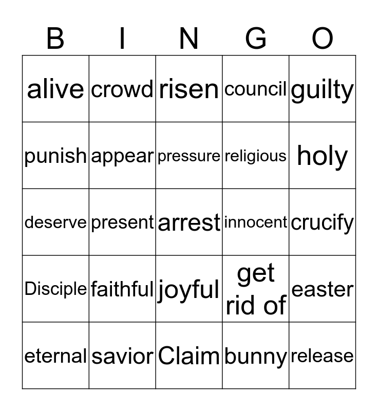This bingo card has 25 words: Disciple, savior, arrest, bunny, guilty, alive, crowd, risen, innocent, easter, punish, appear, Claim, get rid of, holy, eternal, present, pressure, religious, crucify, deserve, faithful, joyful, council and release.