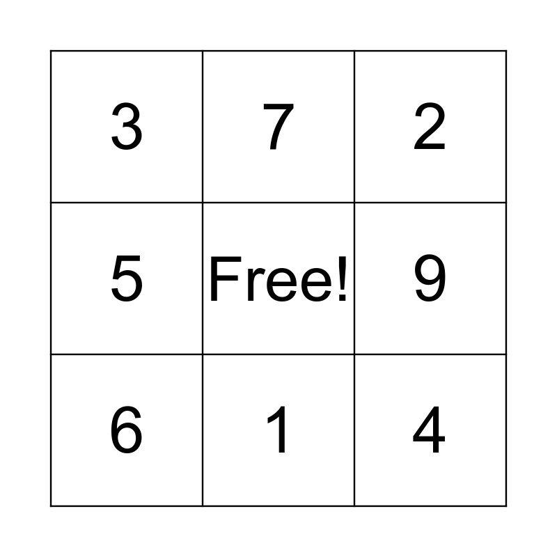 This bingo card has a free space and 10 words: 1, 2, 3, 4, 5, 6, 7, 8, 9 and 10.