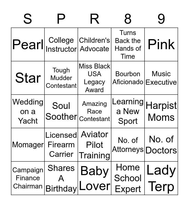 This bingo card has a free space and 24 words: Licensed Firearm Carrier, Shares A Birthday, Miss Black USA Legacy Award, Campaign Finance Chairman, Pink, Pearl, Star, College Instructor, Learning a New Sport, Aviator Pilot Training, Bourbon Aficionado, Wedding on a Yacht, No. of Attorneys, No. of Doctors, Tough Mudder Contestant, Home School Expert, Harpist Moms, Children's Advocate, Music Executive, Soul Soother, Lady Terp, Momager, Turns Back the Hands of Time and Baby Lover.