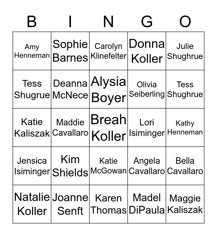 This bingo card has a free space and 34 words: Bella Cavallaro, Madel DiPaula, Idella Seiberling, Carol Farraro, Jensica Isiminger, Deanna McNece, Julie Shughrue, Natalie Koller, Sophie Barnes, Kristiana Montanez, Alysia Boyer, Carolyn Klinefelter, Laura Graham, Erin Kaliszak, Lori Isiminger, Tess Shughrue, Joanne Senft, Katie Kaliszak, Kim Shields, Angela Cavallaro, Katie McGowan, Mary Davis, Amy Henneman, Kathy Henneman, Karen Thomas, Maggie Kaliszak, Donna Koller, Peggy Guenther, Olivia Seiberling, Tess Shugrue, Sarah Shughrue, Maddie Cavallaro, Bella Cavallaro and MaryBeth Staub.