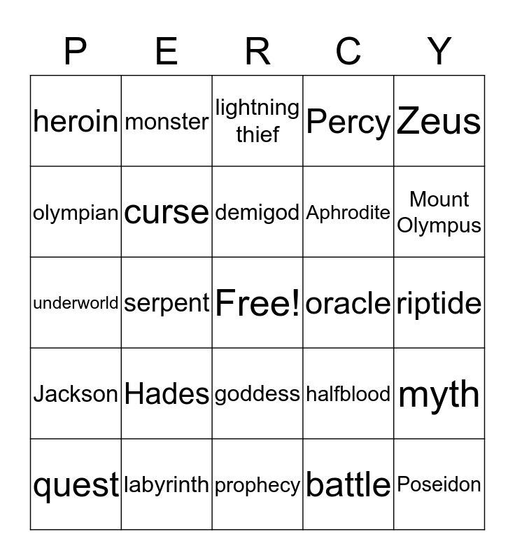 This bingo card has a free space and 29 words: quest, centaur, serpent, legend, heroin, lightning thief, curse, Hades, oracle, labyrinth, riptide, Poseidon, prophecy, battle, Mount Olympus, protector, goddess, Jackson, Zeus, underworld, halfblood, titan, Aphrodite, olympian, Percy, monster, myth, demigod and Athena.
