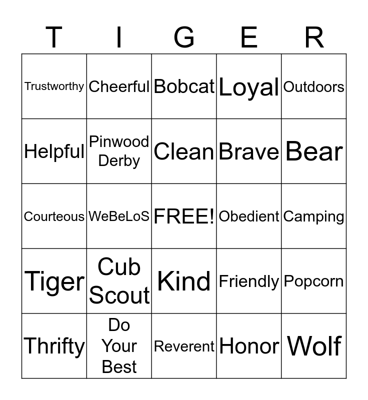 This bingo card has a free space and 24 words: Cub Scout, Do Your Best, Clean, Thrifty, Outdoors, Trustworthy, Helpful, Cheerful, Obedient, Kind, Brave, Courteous, Friendly, Popcorn, Pinwood Derby, Honor, Camping, Bobcat, Bear, WeBeLoS, Wolf, Tiger, Loyal and Reverent.