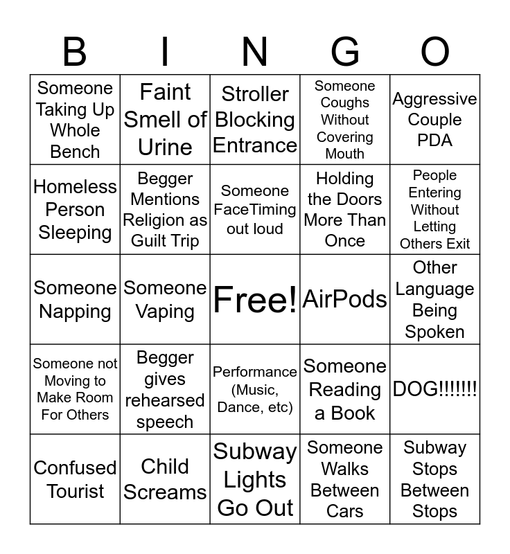 This bingo card has a free space and 24 words: Begger gives rehearsed speech, Child Screams, Someone FaceTiming out loud, Confused Tourist, Aggressive Couple PDA, Someone Taking Up Whole Bench, Homeless Person Sleeping, Faint Smell of Urine, AirPods, Performance (Music, Dance, etc), Holding the Doors More Than Once, Someone Napping, Someone Reading a Book, DOG!!!!!!!, Begger Mentions Religion as Guilt Trip, Someone Walks Between Cars, Other Language Being Spoken, Stroller Blocking Entrance, People Entering Without Letting Others Exit, Someone Vaping, Subway Stops Between Stops, Someone not Moving to Make Room For Others, Someone Coughs Without Covering Mouth and Subway Lights Go Out.