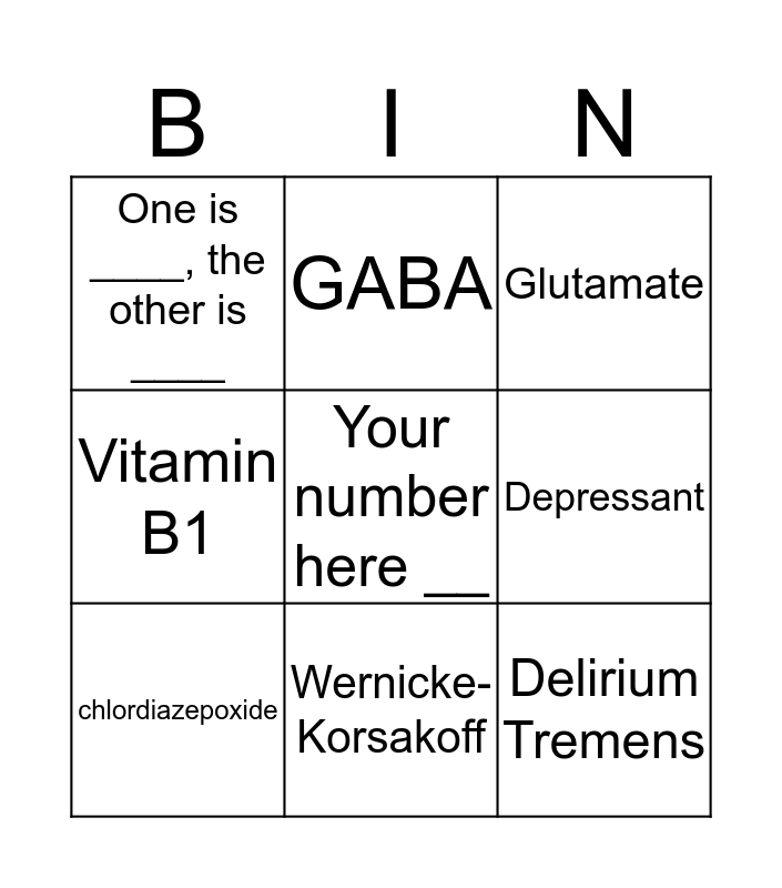 This bingo card has a free space and 8 words: Depressant, Glutamate, GABA, chlordiazepoxide, One is ____, the other is ____, Delirium Tremens, Vitamin B1 and Wernicke-Korsakoff.