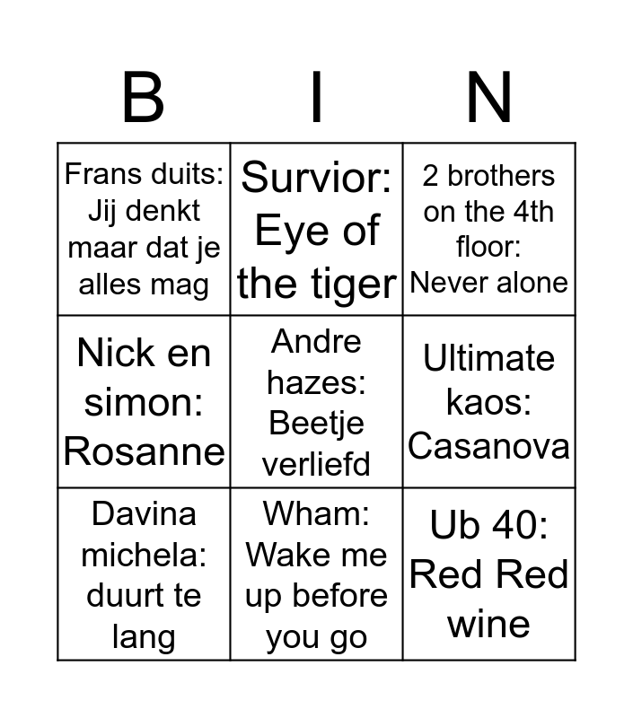 This bingo card has 12 words: Jan Smit: Als de morgen is gekomen, Ub 40: Red Red wine, Andre hazes: Beetje verliefd, Ultimate kaos: Casanova, Survior: Eye of the tiger, 2 brothers on the 4th floor: Never alone, Wham: Wake me up before you go, Blof: Zoutelande, Frans duits: Jij denkt maar dat je alles mag, Nick en simon: Rosanne, Davina michela: duurt te lang and l.
