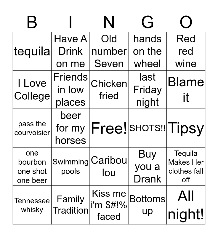 This bingo card has a free space and 29 words: Tennessee whisky, Gin and Juice, beer for my horses, Red Solo Cup, tequila, Old number Seven, Friends in low places, Swimming pools, SHOTS!!, Family Tradition, Tipsy, All night!, Kiss me i'm $#!% faced, Bottoms up, Blame it, 40oz to freedom, Caribou lou, one bourbon one shot one beer, Red red wine, pass the courvoisier, Buy you a Drank, escape (the pina colada song), last Friday night, I Love College, hands on the wheel, Have A Drink on me, Tequila Makes Her clothes fall off, Chicken fried and Whisky river.