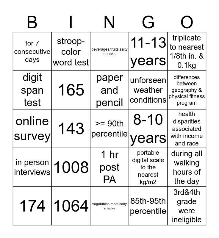 This bingo card has a free space and 24 words: 174, 1008, paper and pencil, 85th-95th percentile, triplicate to nearest 1/8th in. & 0.1kg, for 7 consecutive days, stroop-color word test, beverages,fruits,salty snacks, 8-10 years, health disparities associated with income and race, online survey, 165, portable digital scale to the nearest kg/m2, during all walking hours of the day, digit span test, 1064, vegetables,meat,salty snacks, 11-13 years, differences between geography & physical fitness program, in person interviews, 143, 1 hr post PA, unforseen weather conditions and 3rd&4th grade were ineligible.