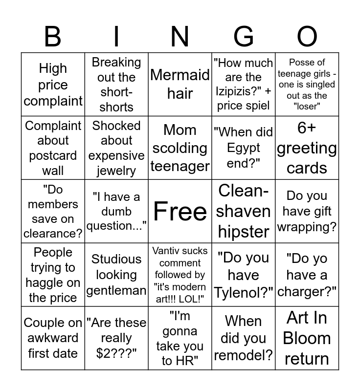 This bingo card has a free space and 24 words: Studious looking gentleman, "Are these really $2???", Mom scolding teenager, Couple on awkward first date, Posse of teenage girls -one is singled out as the "loser", High price complaint, Complaint about postcard wall, Breaking out the short-shorts, Clean-shaven hipster, Vantiv sucks comment followed by "it's modern art!!! LOL!", "When did Egypt end?", "Do members save on clearance?, "Do you have Tylenol?", "Do yo have a charger?", Shocked about expensive jewelry, When did you remodel?, Do you have gift wrapping?, Mermaid hair, 6+ greeting cards, "I have a dumb question...", Art In Bloom return, People trying to haggle on the price, "How much are the Izipizis?" + price spiel and "I'm gonna take you to HR".