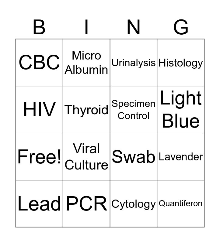 This bingo card has 20 words: Lavender, Urine, Urinalysis, Stool, Lead, HIV, PCR, CBC, Free!, Micro Albumin, Viral Culture, Swab, Thyroid, Quantiferon, Specimen Control, Send Outs, Light Blue, Histology, Cytology and Body fluid.