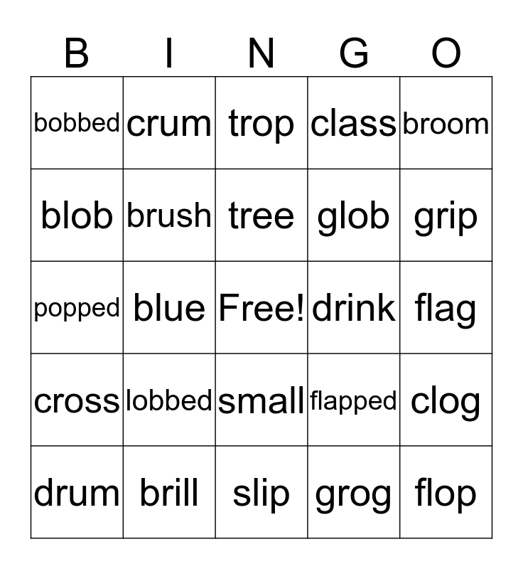 This bingo card has a free space and 34 words: frog, grog, grab, crab, cross, brush, broom, drum, crum, from, tree, trop, trim, frib, drink, grip, brill, popped, lobbed, flapped, small, ball, bobbed, flag, slip, flop, class, glass, glob, blob, black, blue, clog and slug.