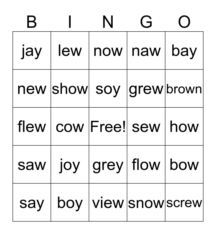 This bingo card has a free space and 24 words: joy, boy, soy, say, bay, jay, new, lew, sew, grey, grew, flew, flow, bow, show, snow, how, now, brown, cow, screw, saw, naw and view.