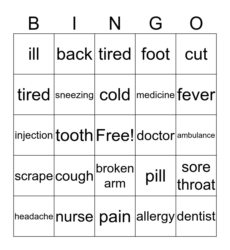 This bingo card has a free space and 29 words: headache, stomach ache, tooth, well, ill, tired, sneezing, cough, doctor, nurse, ambulance, dentist, pain, allergy, fever, toothache, broken arm, scrape, cut, injection, pill, bandage, medicine, tired, foot, back, sore throat, cold and head.
