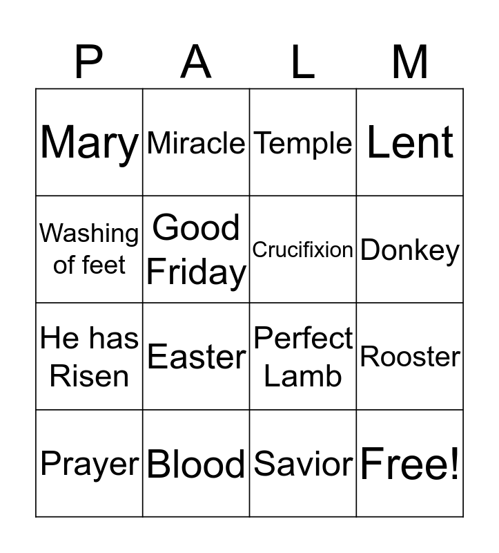 This bingo card has 16 words: Prayer, Blood, Temple, Lent, Washing of feet, Miracle, Perfect Lamb, Rooster, Mary, Good Friday, Savior, Donkey, He has Risen, Easter, Crucifixion and Free!.
