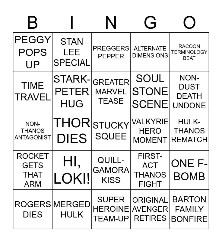 This bingo card has a free space and 29 words: ROGERS DIES, STARK DIES, THOR DIES, BANNER DIES, PEGGY POPS UP, PREGGERS PEPPER, STARK-PETER HUG, HI, LOKI!, VALKYRIE HERO MOMENT, MERGED HULK, HULK-THANOS REMATCH, BARTON FAMILY BONFIRE, SUPER HEROINE TEAM-UP, ORIGINAL AVENGER RETIRES, NON-DUST DEATH UNDONE, STAR LORD SHADE, QUILL-GAMORA KISS, ROCKET GETS THAT ARM, RACOON TERMINOLOGY BEAT, NON-THANOS ANTAGONIST, FIRST-ACT THANOS FIGHT, CAPTAIN MARVEL SCREWS UP, SOUL STONE SCENE, TIME TRAVEL, ALTERNATE DIMENSIONS, STAN LEE SPECIAL, ONE F-BOMB, GREATER MARVEL TEASE and YOUNG AVENGER TEASE.