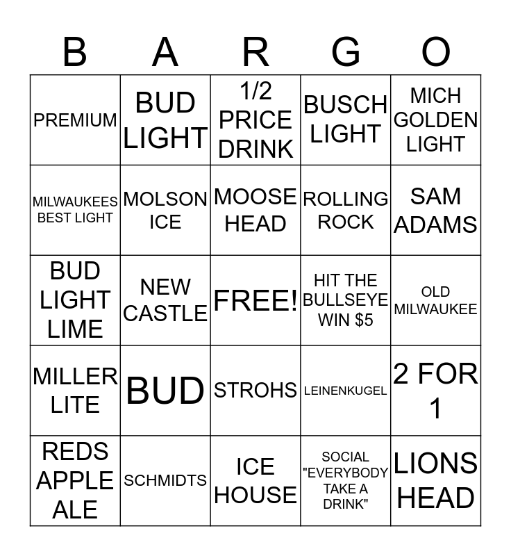 This bingo card has a free space and 24 words: BUD, SCHMIDTS, MOOSE HEAD, REDS APPLE ALE, MICH GOLDEN LIGHT, PREMIUM, MILWAUKEES BEST LIGHT, BUD LIGHT, HIT THE BULLSEYE WIN $5, STROHS, ROLLING ROCK, BUD LIGHT LIME, LEINENKUGEL, 2 FOR 1, MOLSON ICE, SOCIAL "EVERYBODY TAKE A DRINK", OLD MILWAUKEE, 1/2 PRICE DRINK, SAM ADAMS, NEW CASTLE, LIONS HEAD, MILLER LITE, BUSCH LIGHT and ICE HOUSE.