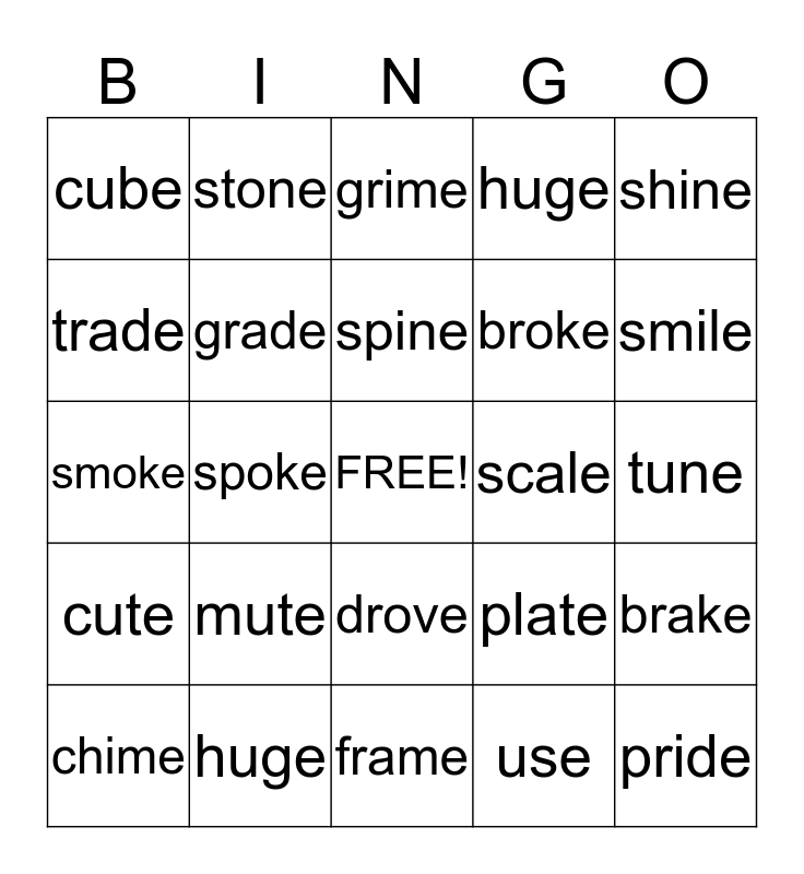 This bingo card has a free space and 28 words: brake, glide, broke, use, trade, grime, stone, cute, scale, chime, smoke, huge, huge, frame, smile, globe, mute, grade, spine, drove, cube, snake, pride, spoke, tune, plate, shine and stole.