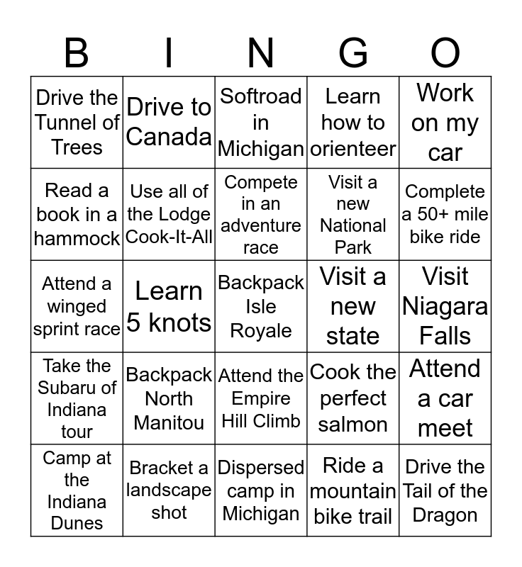 This bingo card has a free space and 24 words: Backpack North Manitou, Bracket a landscape shot, Compete in an adventure race, Camp at the Indiana Dunes, Work on my car, Drive the Tunnel of Trees, Read a book in a hammock, Drive to Canada, Visit a new state, Attend the Empire Hill Climb, Visit a new National Park, Attend a winged sprint race, Cook the perfect salmon, Attend a car meet, Use all of the Lodge Cook-It-All, Ride a mountain bike trail, Visit Niagara Falls, Softroad in Michigan, Complete a 50+ mile bike ride, Learn 5 knots, Drive the Tail of the Dragon, Take the Subaru of Indiana tour, Learn how to orienteer and Dispersed camp in Michigan.