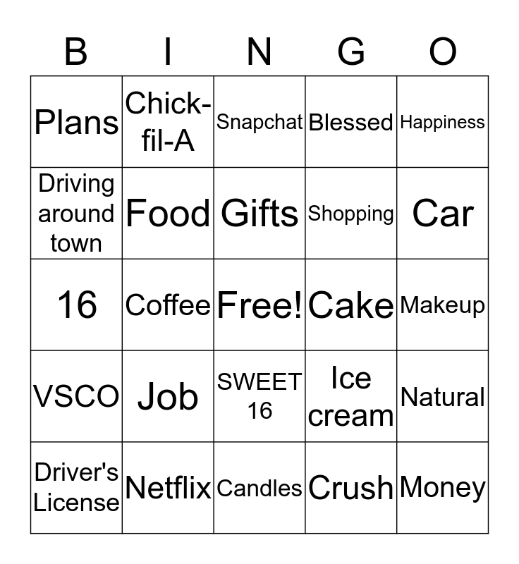 This bingo card has a free space and 29 words: Driver's License, High school, Coffee, Birthday, Plans, Snapchat, Food, Job, Cake, Netflix, Makeup, Money, Candles, Crush, Car, Spotify/ Apple Music, SWEET 16, VSCO, Happiness, 16, Ice cream, Parties, Shopping, Driving around town, Blessed, Chick-fil-A, Natural, Gifts and Travel.