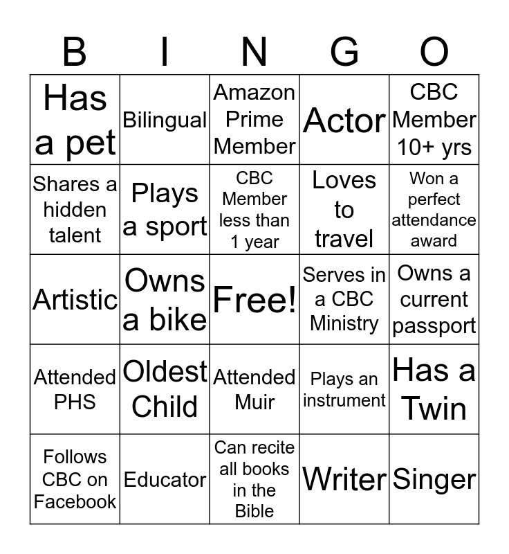This bingo card has a free space and 24 words: Oldest Child, Educator, CBC Member less than 1 year, Follows CBC on Facebook, CBC Member 10+ yrs, Has a pet, Shares a hidden talent, Bilingual, Serves in a CBC Ministry, Attended Muir, Loves to travel, Artistic, Plays an instrument, Has a Twin, Plays a sport, Writer, Owns a current passport, Amazon Prime Member, Won a perfect attendance award, Owns a bike, Singer, Attended PHS, Actor and Can recite all books in the Bible.