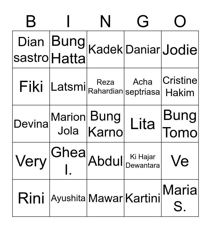 This bingo card has a free space and 24 words: Ghea I., Ayushita, Reza Rahardian, Rini, Jodie, Dian sastro, Fiki, Bung Hatta, Lita, Abdul, Acha septriasa, Devina, Ki Hajar Dewantara, Ve, Latsmi, Kartini, Bung Tomo, Kadek, Cristine Hakim, Marion Jola, Maria S., Very, Daniar and Mawar.