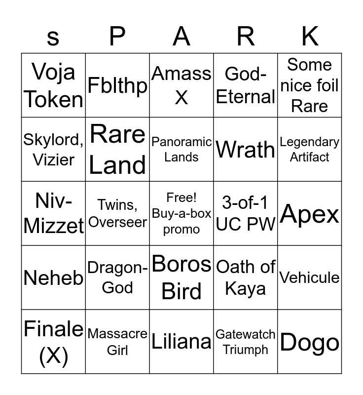 This bingo card has a free space and 24 words: Dragon-God, Massacre Girl, Panoramic Lands, Finale (X), Some nice foil Rare, Voja Token, Skylord, Vizier, Fblthp, 3-of-1 UC PW, Boros Bird, Wrath, Niv-Mizzet, Oath of Kaya, Vehicule, Rare Land, Gatewatch Triumph, Apex, Amass X, Legendary Artifact, Twins, Overseer, Dogo, Neheb, God-Eternal and Liliana.