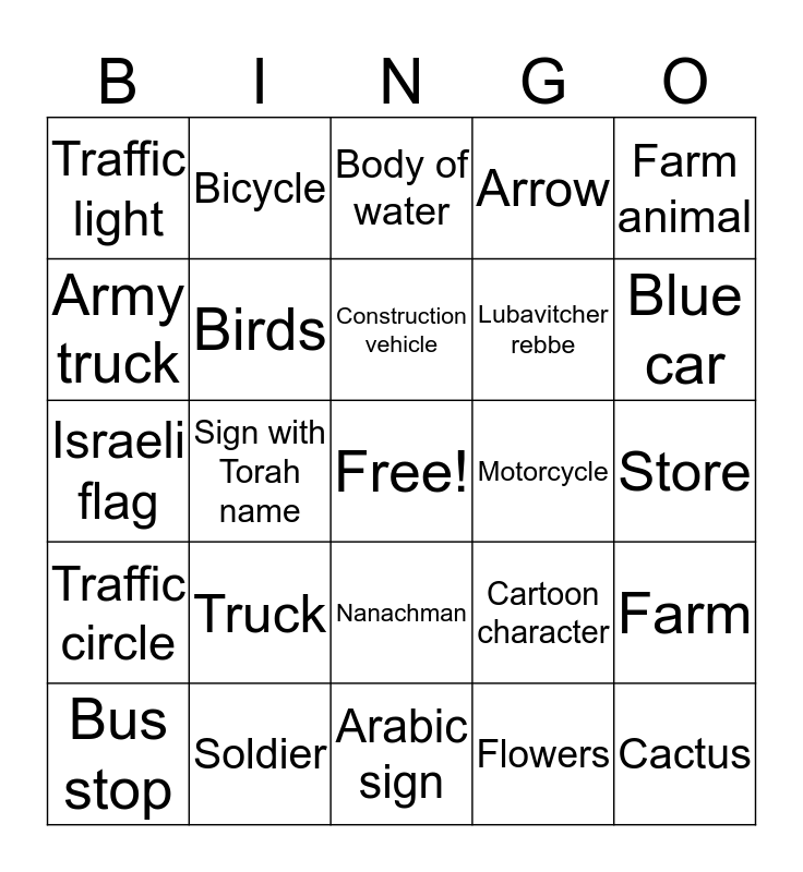 This bingo card has a free space and 24 words: Truck, Soldier, Construction vehicle, Bus stop, Farm animal, Traffic light, Army truck, Bicycle, Motorcycle, Nanachman, Lubavitcher rebbe, Israeli flag, Cartoon character, Farm, Birds, Flowers, Store, Body of water, Blue car, Sign with Torah name, Cactus, Traffic circle, Arrow and Arabic sign.