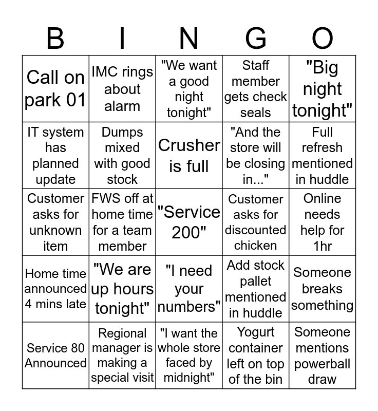 This bingo card has a free space and 24 words: "We are up hours tonight", Regional manager is making a special visit, Crusher is full, Service 80 Announced, "Big night tonight", Call on park 01, IT system has planned update, IMC rings about alarm, Customer asks for discounted chicken, "I need your numbers", "And the store will be closing in...", Customer asks for unknown item, Add stock pallet mentioned in huddle, Someone breaks something, Dumps mixed with good stock, Yogurt container left on top of the bin, Online needs help for 1hr, "We want a good night tonight", Full refresh mentioned in huddle, FWS off at home time for a team member, Someone mentions powerball draw, Home time announced 4 mins late, Staff member gets check seals and "I want the whole store faced by midnight".