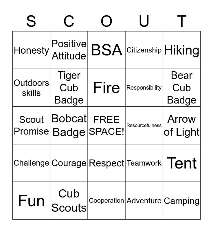 This bingo card has a free space and 24 words: Courage, Cub Scouts, Fire, Fun, Hiking, Honesty, Outdoors skills, Positive Attitude, Resourcefulness, Respect, Responsibility, Scout Promise, Teamwork, Tent, Tiger Cub Badge, Adventure, Arrow of Light, BSA, Bear Cub Badge, Bobcat Badge, Camping, Challenge, Citizenship and Cooperation.
