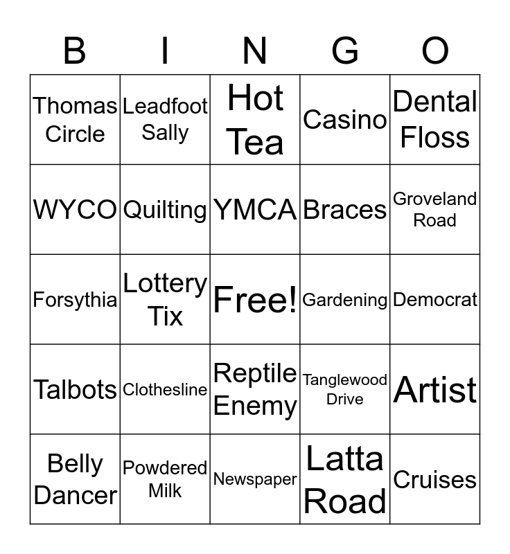 This bingo card has a free space and 24 words: Clothesline, Powdered Milk, YMCA, Belly Dancer, Dental Floss, Thomas Circle, WYCO, Leadfoot Sally, Gardening, Reptile Enemy, Braces, Forsythia, Tanglewood Drive, Artist, Quilting, Latta Road, Democrat, Hot Tea, Groveland Road, Lottery Tix, Cruises, Talbots, Casino and Newspaper.