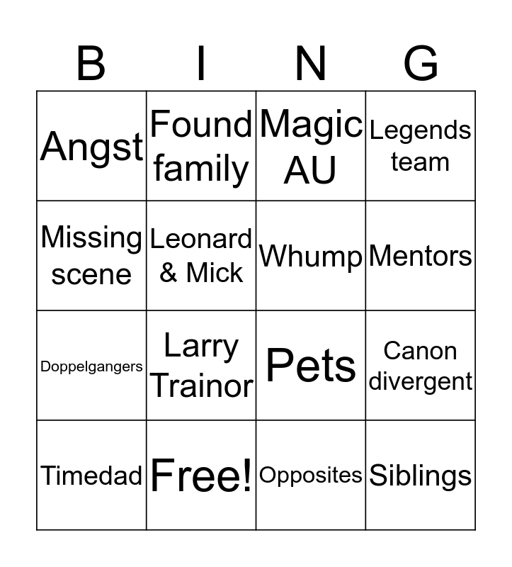 This bingo card has 16 words: Free!, Canon divergent, Magic AU, Angst, Doppelgangers, Found family, Pets, Opposites, Missing scene, Leonard & Mick, Timedad, Legends team, Larry Trainor, Mentors, Whump and Siblings.