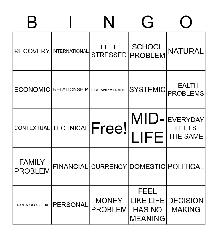 This bingo card has a free space and 24 words: FINANCIAL, PERSONAL, ORGANIZATIONAL, TECHNOLOGICAL, NATURAL, RECOVERY, ECONOMIC, INTERNATIONAL, MID-LIFE, CURRENCY, SYSTEMIC, CONTEXTUAL, DOMESTIC, POLITICAL, RELATIONSHIP, FEEL LIKE LIFE HAS NO MEANING, EVERYDAY FEELS THE SAME, FEEL STRESSED, HEALTH PROBLEMS, TECHNICAL, DECISION MAKING, FAMILY PROBLEM, SCHOOL PROBLEM and MONEY PROBLEM.