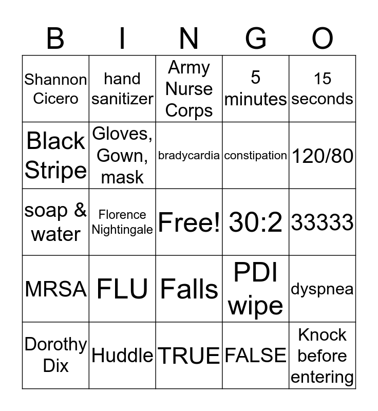 This bingo card has a free space and 29 words: Dorothy Dix, 1 breath every 5-6 seconds, Florence Nightingale, Lamp, Shannon Cicero, Army Nurse Corps, Gloves, Gown, mask, FLU, 30:2, Huddle, 33333, Knock before entering, TRUE, FALSE, 120/80, 60-100, Falls, MRSA, 15 seconds, soap & water, PDI wipe, at the beginning of each quarter, constipation, Black Stripe, 5 minutes, hand sanitizer, dyspnea, bradycardia and 7 days from opening.