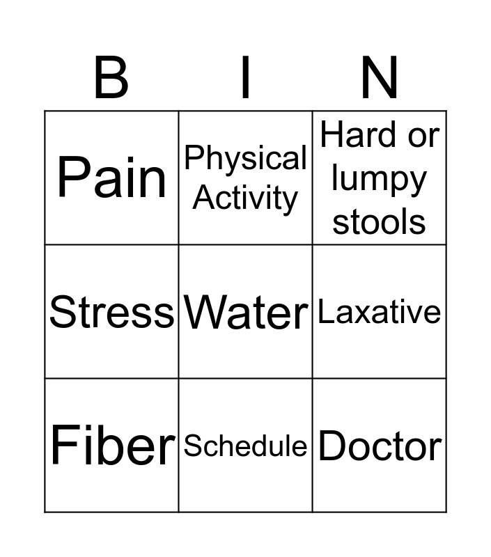 This bingo card has 10 words: Schedule, Hard or lumpy stools, Pain, Water, Stress, Fiber, Physical Activity, Sugar, Laxative and Doctor.